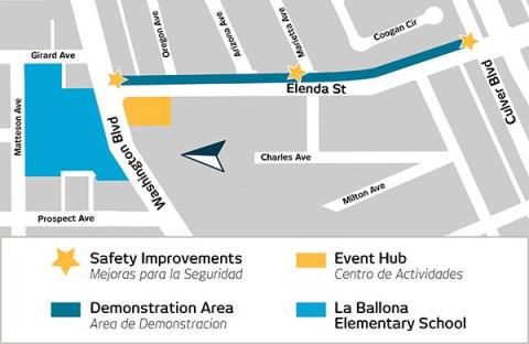 Experience Elenda will demonstrate a two-way separated cycle track on Elenda Street between Washington Blvd. and Culver Blvd., a four-way stop at Marietta Avenue, and intersection treatments at Washington Blvd. and Culver Blvd.