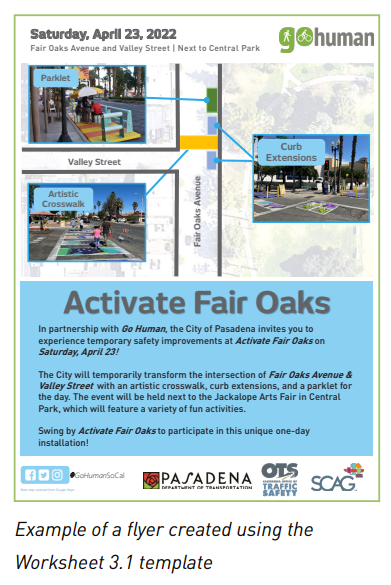 SCAG’s Go Human Kit of Parts Lending Library provides pop-up materials to temporarily demonstrate potential and planned street design improvements and safety infrastructure, including parklets, curb extensions (bulb – outs), median refuge islands, artistic crosswalks, and separated bike lanes. By showcasing these different improvements, community members get to experience and test out more complete streets that are re-designed for safety in live traffic settings.