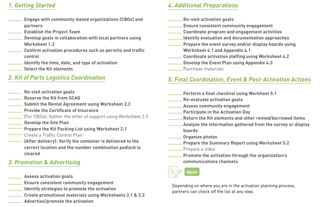 The Playbook serves as a step-by-step guide to implement temporary, pop-up improvements using the Kit of Parts. Dive into the 5-step checklist below!